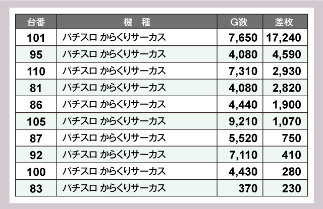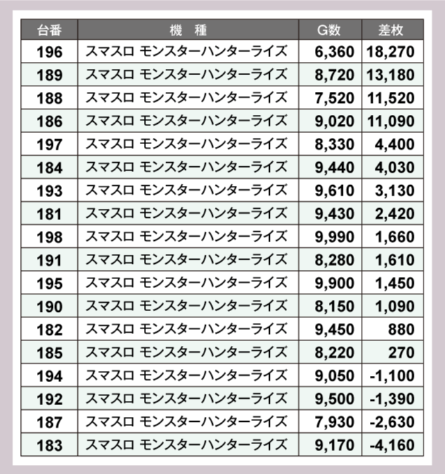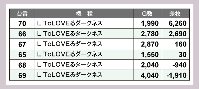 また、その他の機種では『スマスロ モンスターハンターライズ』から夢の万枚超が4台、『パチスロ からくりサーカス』からは+17,240枚が飛び出す盛況ぶりを披露。さらに、『L ToLOVEるダークネス』も全6台中4台がプラス差枚となっている。