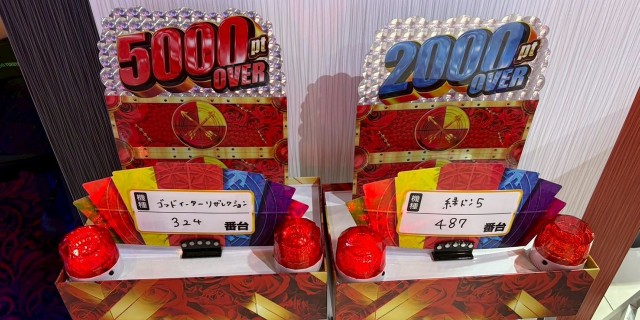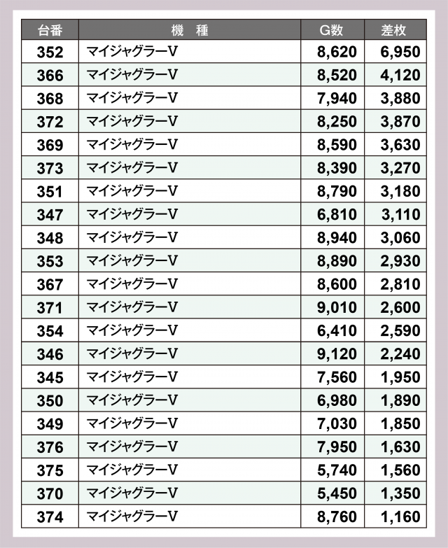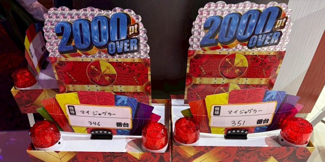パチスロコーナーで目が離せないのは『マイジャグラーⅤ』。設置21台全てが4桁プラスに成功し、352番台は+7,000枚弱とボーナスタイプの潜在能力をフルに発揮、その他にも優良台が続出していた。