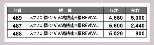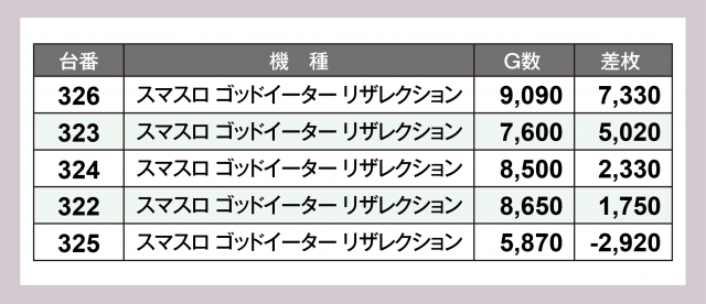 一方、『スマスロ ゴッドイーター リザレクション』も高勝率かつ+7,300枚超&+5,000枚超が1台ずつ、『スマスロ 緑ドン VIVA!情熱南米編 REVIVAL』は3台全台が勝利&+5,000枚超の台が生じるなど、大きなチャンスが潜んでいるのが感じられた。
