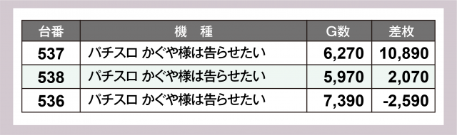 20スロコーナーでの最注目は『パチスロ かぐや様は告らせたい』。537番台が5桁プラスを計上し、大きな盛り上がりに達していた。