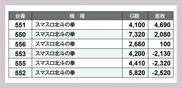 その他では、『スマスロ北斗の拳』『マイジャグラーⅤ』『パチスロディスクアップ2』と、幅広いラインナップに優秀台が見受けられた。