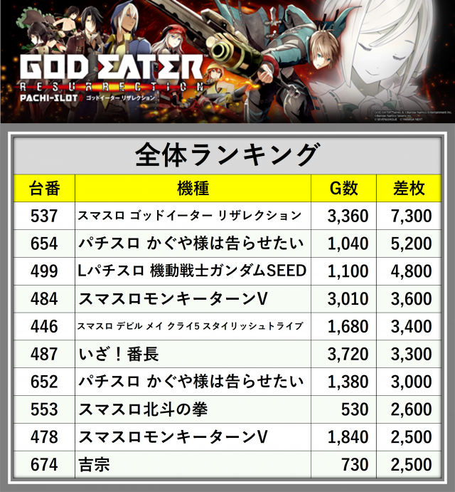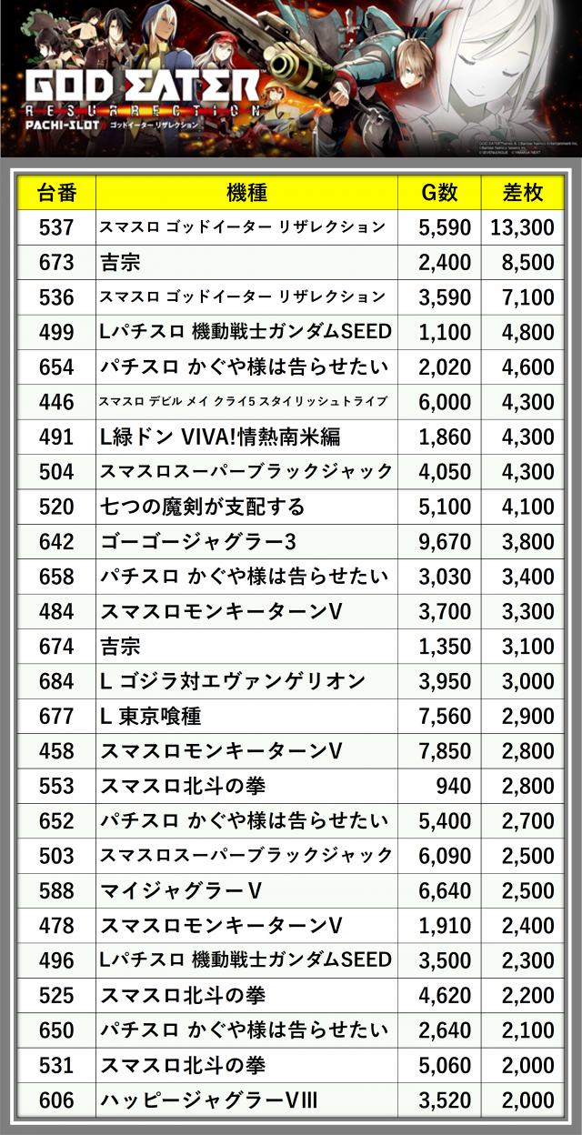 ※差枚数順に掲載しています