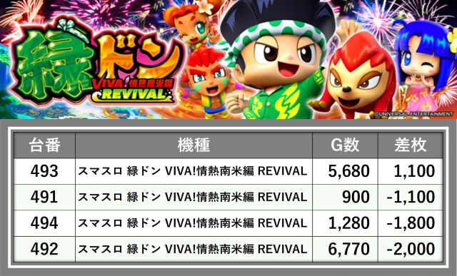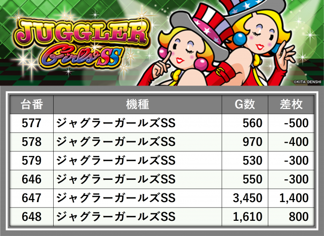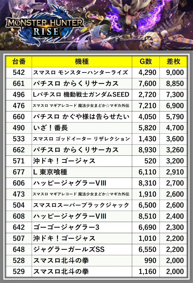 厳選された取材対象機種をはじめ、その他スロット全体から好記録が飛び出した!プレイヤーが楽しんだ1日を下記データにて振り返ってみて欲しい。