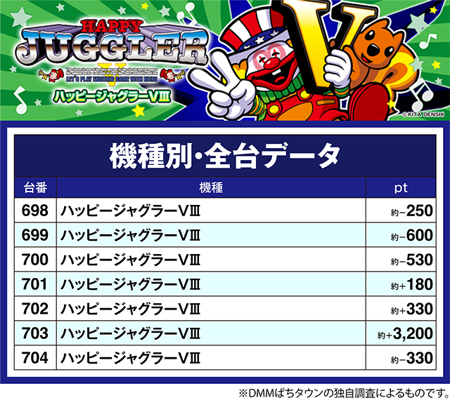 「ハッピージャグラーVⅢ」の703番台が約+3,200pt。