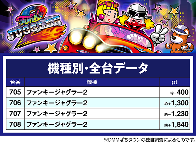 4台設置の「ファンキージャグラー2」では、2台が約+1,300pt以上を記録。