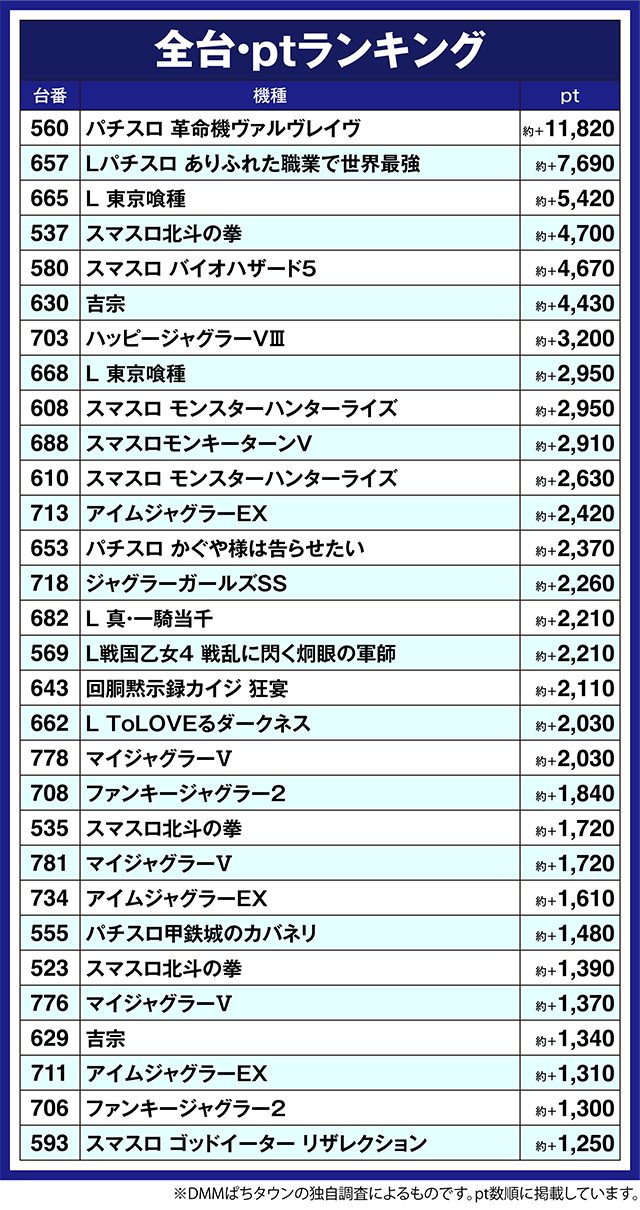 2台が約+2,900ptを超えた「L 東京喰種」では、665番台が約+5,500ptクラス。