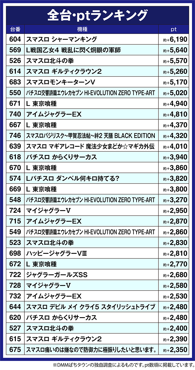 「L戦国乙女4 戦乱に閃く炯眼の軍師」の569番台と「スマスロ北斗の拳」の526番台も約+5,500pt以上となった。