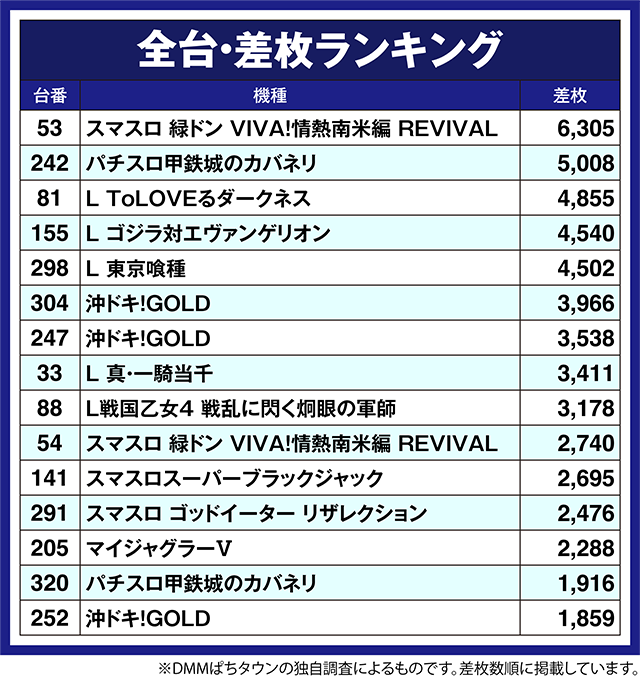 「沖ドキ!GOLD」の304番台と247番台が3,500pt以上。