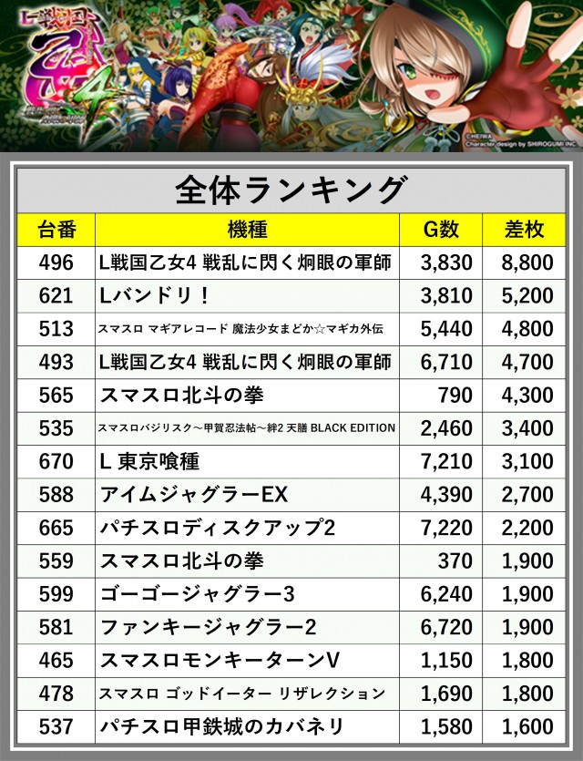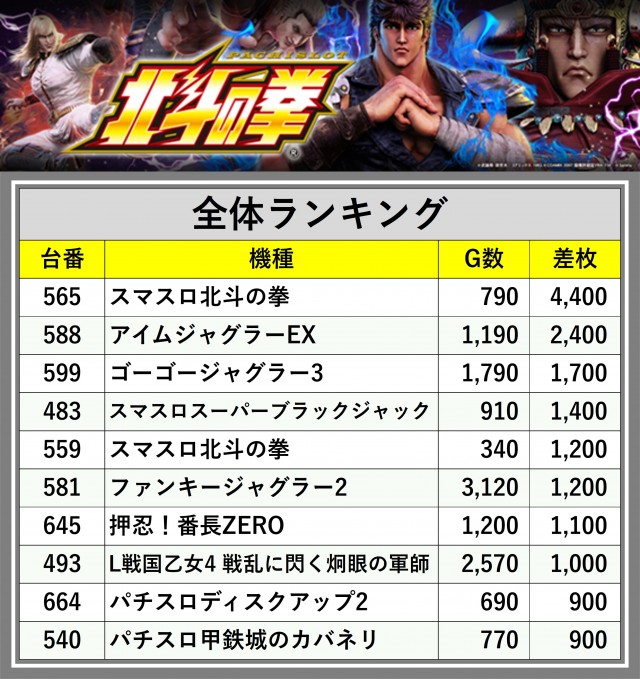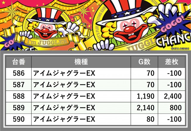 厳選された取材対象機種をはじめ、その他スロット全体から好記録が飛び出した!プレイヤーが楽しんだ1日を下記データにて振り返ってみて欲しい。