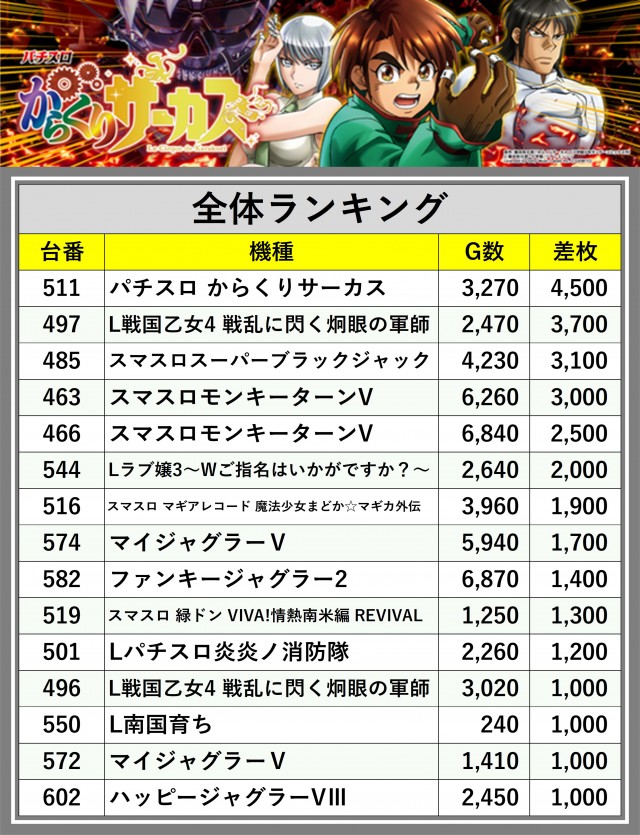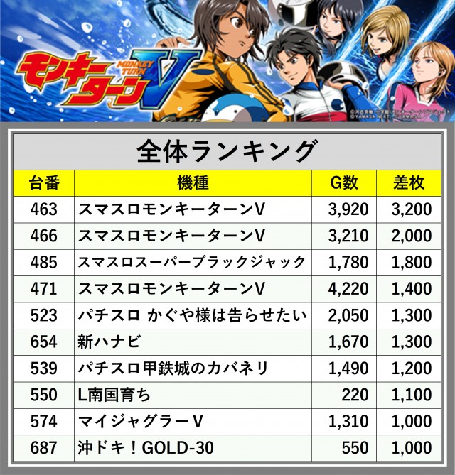 厳選された取材対象機種をはじめ、その他スロット全体から好記録が飛び出した!プレイヤーが楽しんだ1日を下記データにて振り返ってみて欲しい。