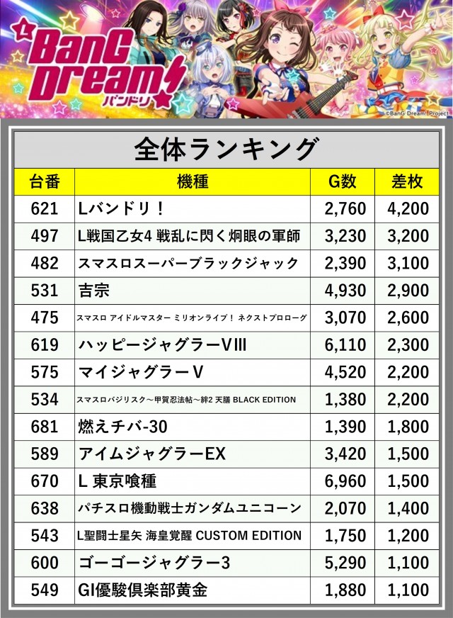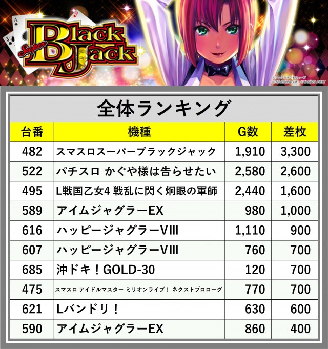 厳選された取材対象機種をはじめ、その他スロット全体から好記録が飛び出した!プレイヤーが楽しんだ1日を下記データにて振り返ってみて欲しい。