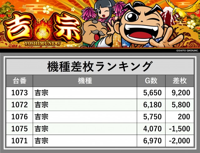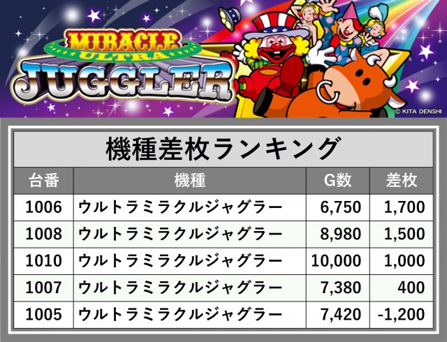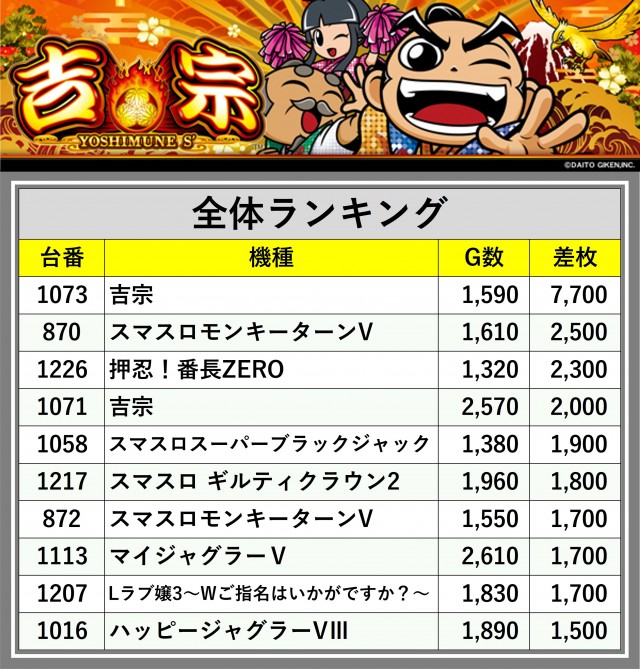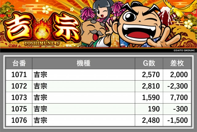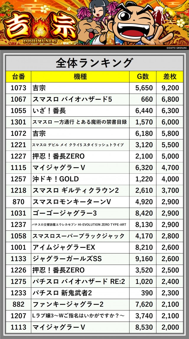 厳選された取材対象機種をはじめ、その他スロット全体から好記録が飛び出した!プレイヤーが楽しんだ1日を下記データにて振り返ってみて欲しい。