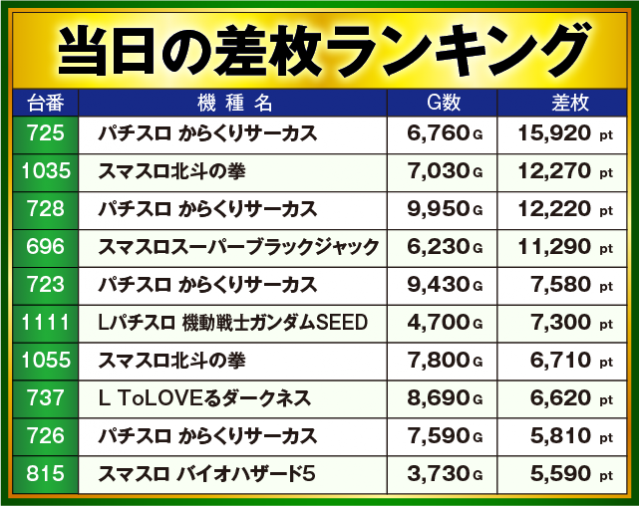 Super D’STATION前橋大利根店 差枚ランキング(6月1日)