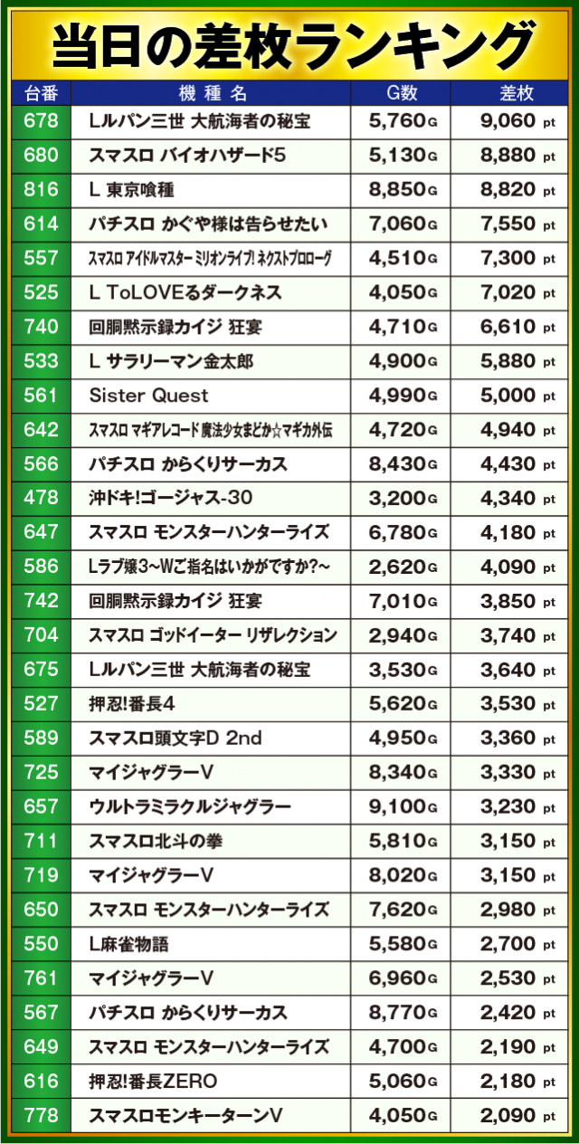 レポートの最後に「Super D’STATIONガーデン前橋店」の差枚ランキングも掲載!