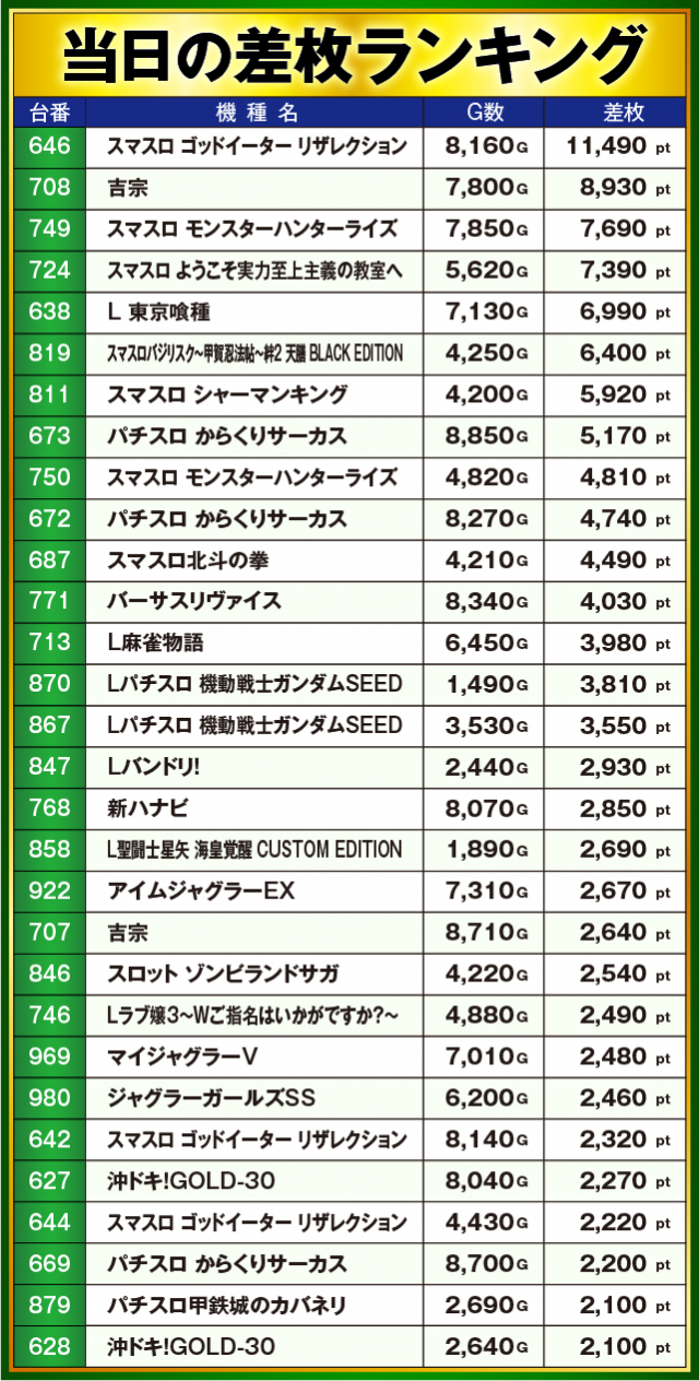 ※差枚数順に掲載しています