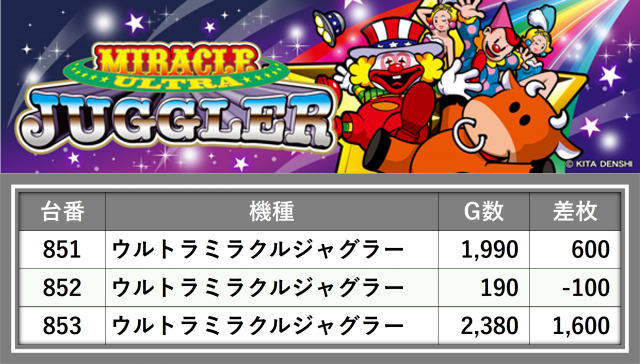 厳選された取材対象機種をはじめ、その他スロット全体から好記録が飛び出した!プレイヤーが楽しんだ1日を下記データにて振り返ってみて欲しい。