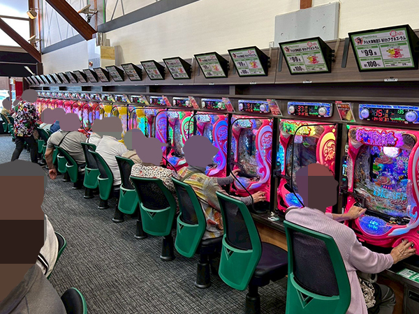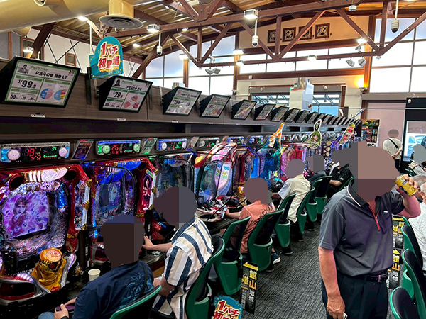 15時半ごろの100円/91玉パチンコでは「PA大海物語5 Withアグネス・ラム」や「デジハネP北斗の拳 慈母」などの甘デジで好調なプレイヤーが多数見受けられ、時折見せる嬉しそうな表情が印象に残っている。