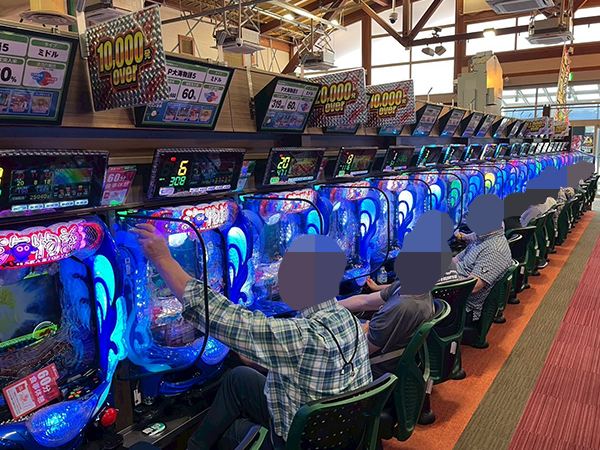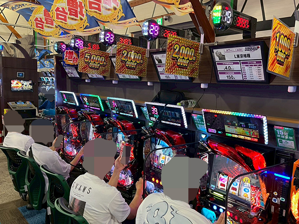 取材時は多くのプレイヤーが来店。パチンコ・パチスロともに、様々な機種が支持を得ていた。