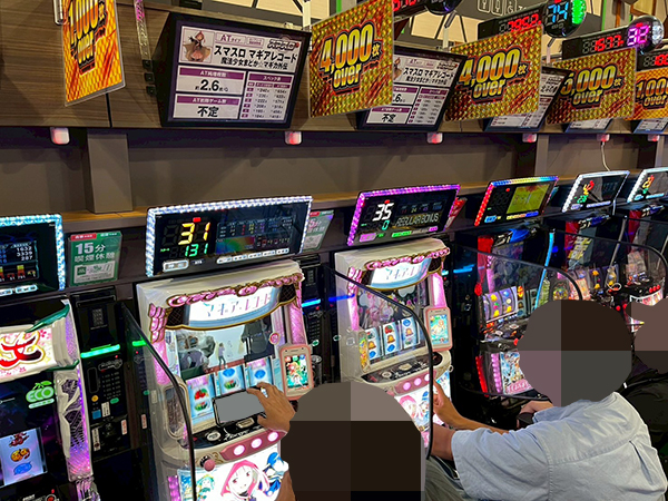 500円/90枚パチスロに目を移すと、楽しそうにレバーを叩くプレイヤーの姿が至る所で見られた。
