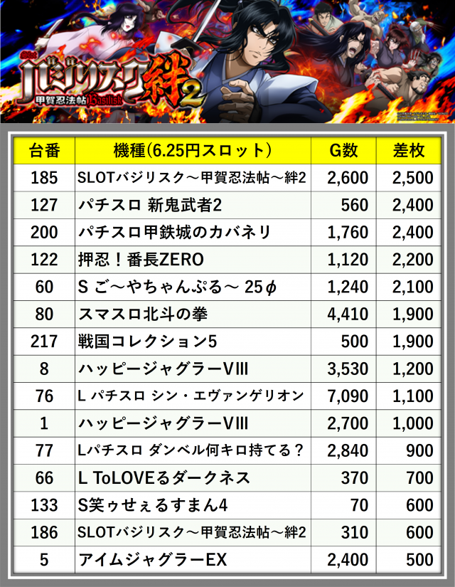 厳選された取材対象機種をはじめ、その他スロット全体から好記録が飛び出した!プレイヤーが楽しんだ1日を下記データにて振り返ってみて欲しい。