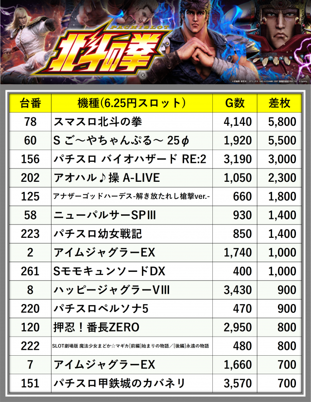 厳選された取材対象機種をはじめ、その他スロット全体から好記録が飛び出した!プレイヤーが楽しんだ1日を下記データにて振り返ってみて欲しい。