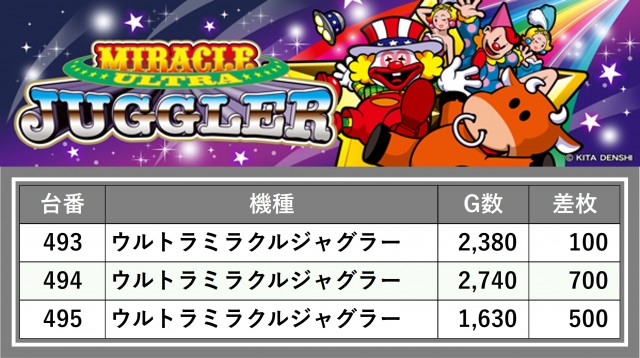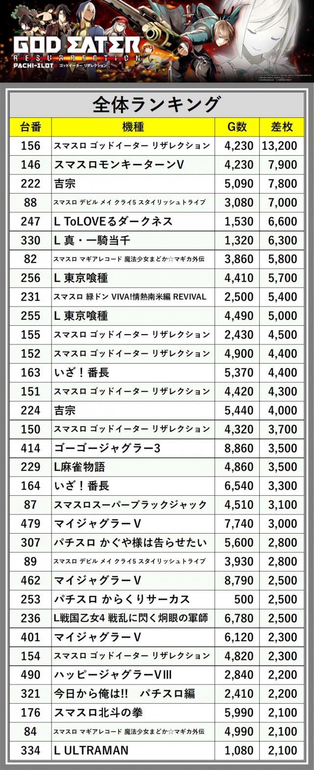 厳選された取材対象機種をはじめ、その他スロット全体から好記録が飛び出した!プレイヤーが楽しんだ1日を下記データにて振り返ってみて欲しい。