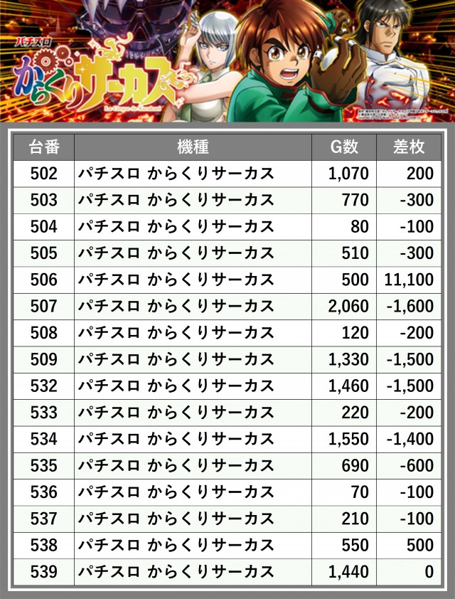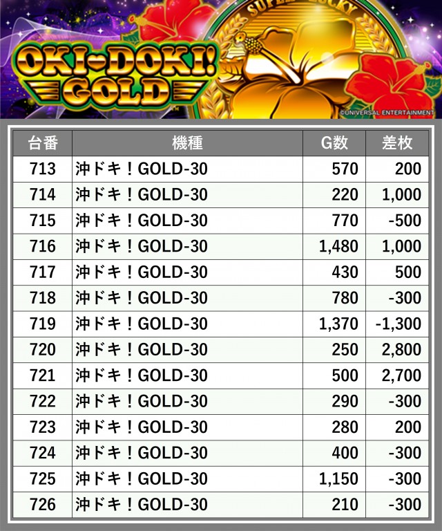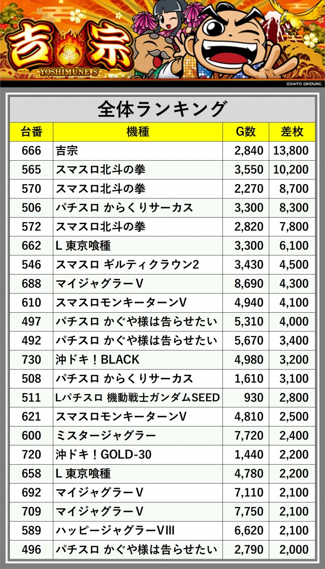 厳選された取材対象機種をはじめ、その他スロット全体から好記録が飛び出した!プレイヤーが楽しんだ1日を下記データにて振り返ってみて欲しい。