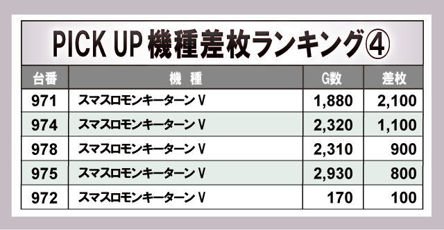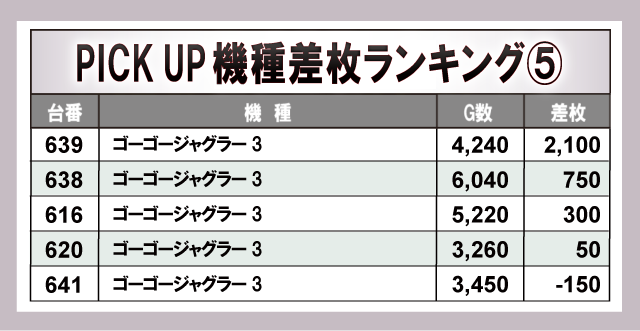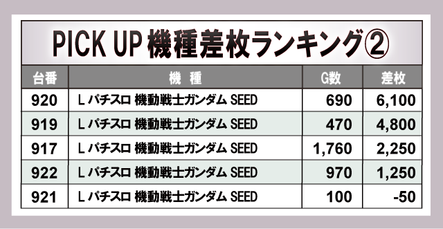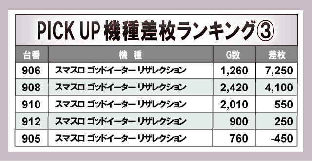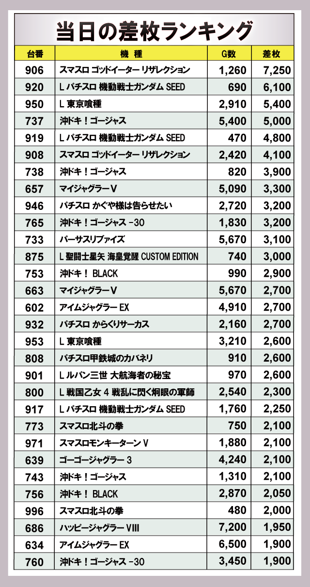 『スマスロ ゴッドイーター リザレクション』から+7,000枚OVER『Lパチスロ 機動戦士ガンダムSEED』から+6,000枚OVERが発生し、店内の盛り上がりを大きくリードしていた!また上表を見ての通り、『ジャグラー』シリーズや『沖ドキ』シリーズが多数ランクインしていることから、スペック問わずにチャンスがあったと窺える!