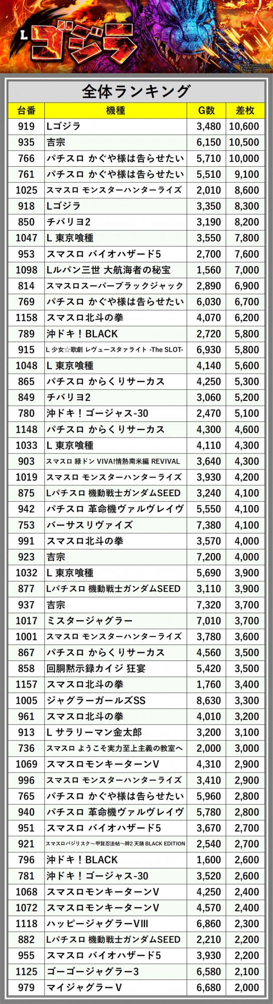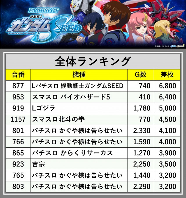 厳選された取材対象機種をはじめ、その他スロット全体から好記録が飛び出した!プレイヤーが楽しんだ1日を下記データにて振り返ってみて欲しい。