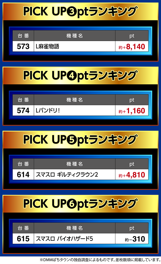 「スマスロ ギルティクラウン2」の614番台は約+4,810pt、「Lバンドリ!」の574番台も約+1,160ptを記録。