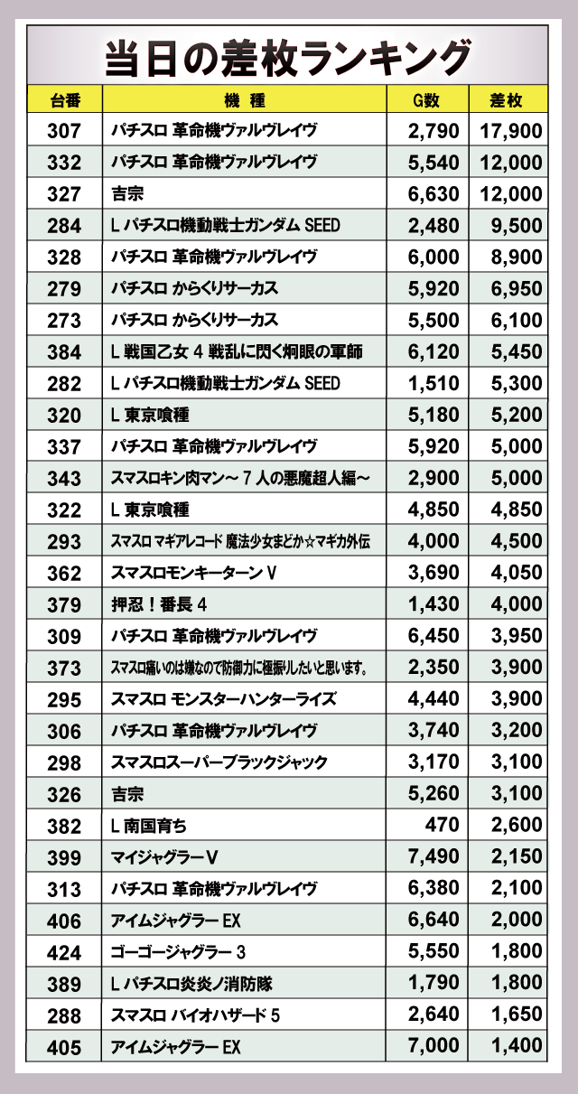 『パチスロ 革命機ヴァルヴレイヴ』『吉宗』の2機種から計3台の万枚OVERが発生。なかでも『パチスロ 革命機ヴァルヴレイヴ』はコンプリート目前の+17,900枚をマーク!ほかにも数多くの台がまとまった出玉を確保しており、店内は大きな熱気に包まれていたようだ。