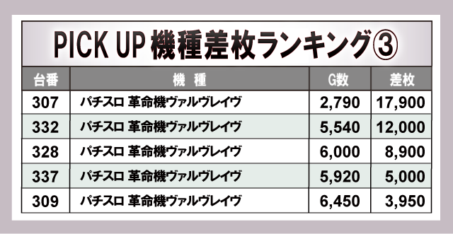 『パチスロ 革命機ヴァルヴレイヴ』は前述した台以外にも大きな熱気を放っている台があり、遊技していたファンが明らかな好感触を掴んでいたのは間違いない。他にも『吉宗』や『L 東京喰種』は全台プラス差枚を獲得しており、『マイジャグラーⅤ』でも大きなマイナスが見られずコンスタントなボーナス当選を披露していたことから、ファンを歓喜させた存在だったと言えるだろう。