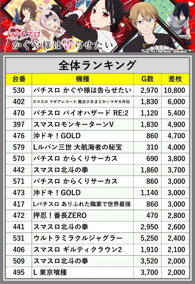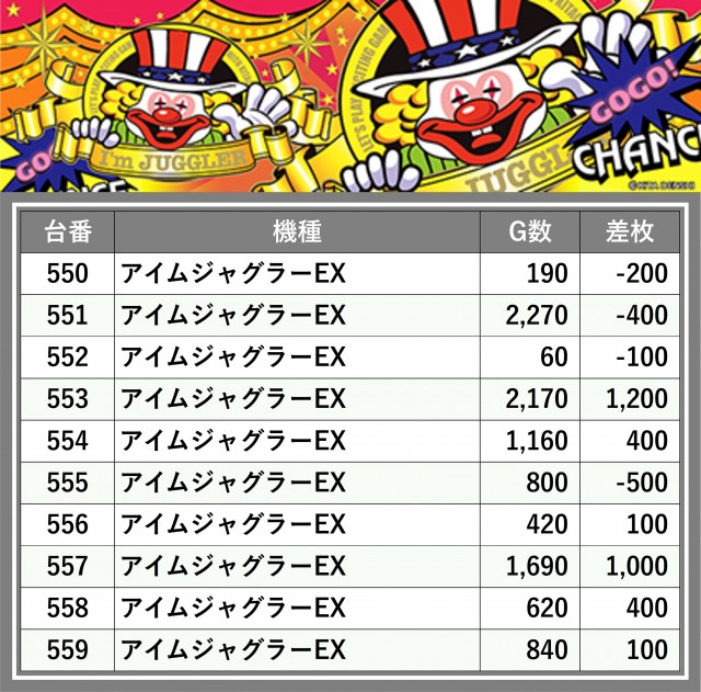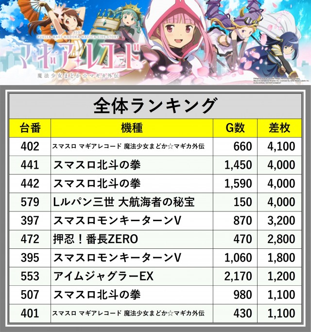 厳選された取材対象機種をはじめ、その他スロット全体から好記録が飛び出した!プレイヤーが楽しんだ1日を下記データにて振り返ってみて欲しい。