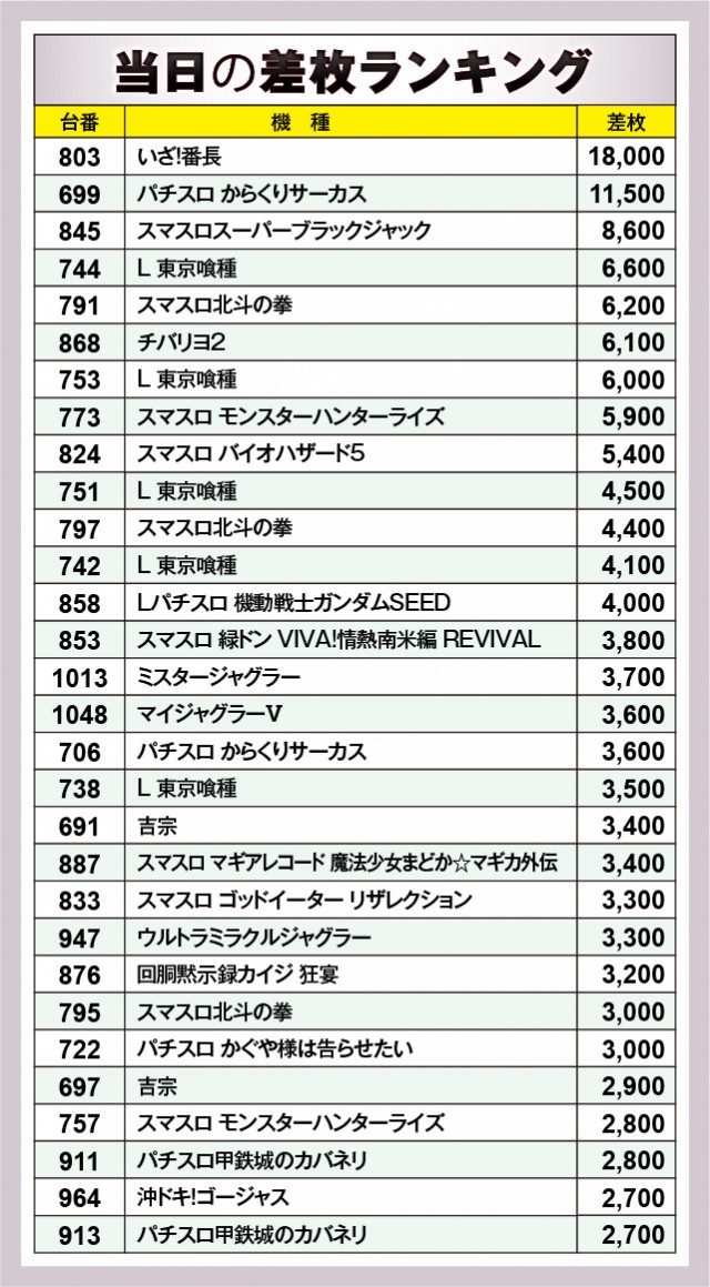 『いざ!番長』『パチスロ からくりサーカス』から万枚OVERが飛び出し、当たり前のように万枚台を輩出する同店の高い実力に脱帽せざるを得ない。『スマスロスーパーブラックジャック』でも8,000枚OVERが記録され、大台突破を果たした台も多いことから、ファンは大きな熱気に笑みを浮かべていた。全体的にまとまった出玉を確保しており、誰もが有意義な時間を過ごしていたことだろう。