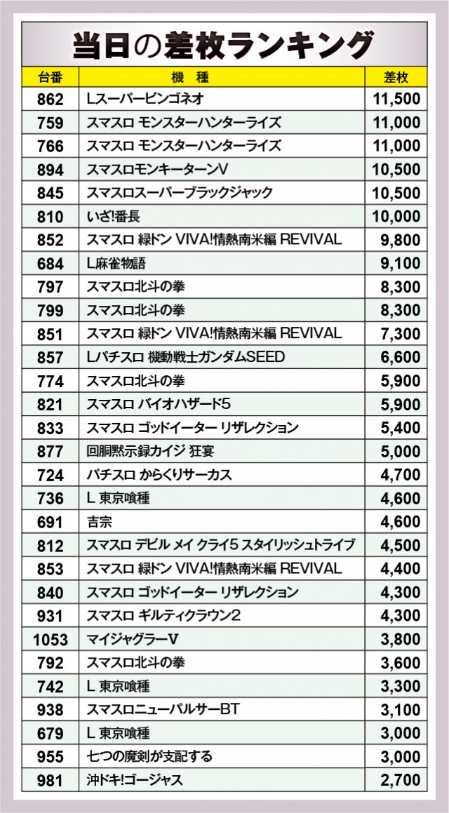 毎回当然のように万枚OVERを輩出する同店だが、この日も『Lスーパービンゴネオ』『スマスロ モンスターハンターライズ』『スマスロモンキーターンV』『スマスロスーパーブラックジャック』『いざ!番長』から合計6台の万枚台が生まれた。他にも大台突破台を果たした台は多く、上表を見れば分かるように半数以上となっているのは鮮烈であるばかり。ファンは右肩上がりの熱気に触れたことで、自然とレバーONが強くなったことだろう。
