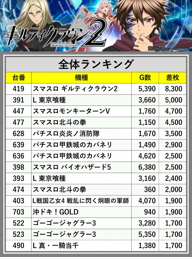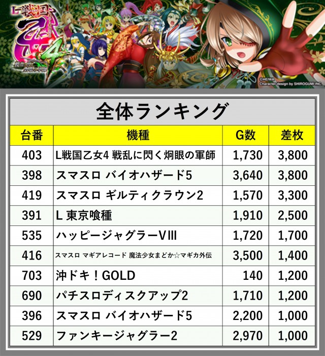 厳選された取材対象機種をはじめ、その他スロット全体から好記録が飛び出した!プレイヤーが楽しんだ1日を下記データにて振り返ってみて欲しい。