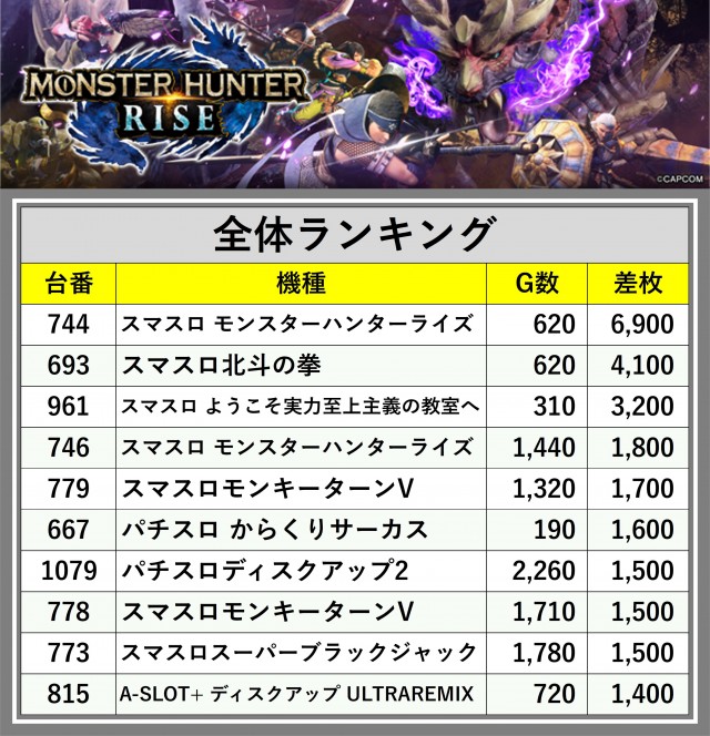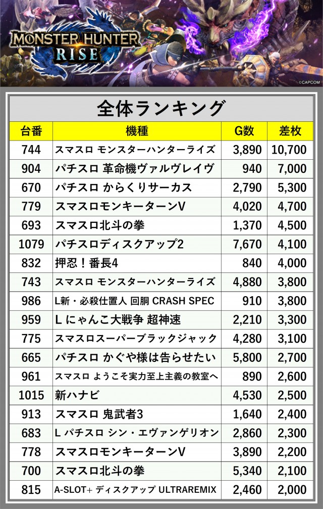 厳選された取材対象機種をはじめ、その他スロット全体から好記録が飛び出した!プレイヤーが楽しんだ1日を下記データにて振り返ってみて欲しい。