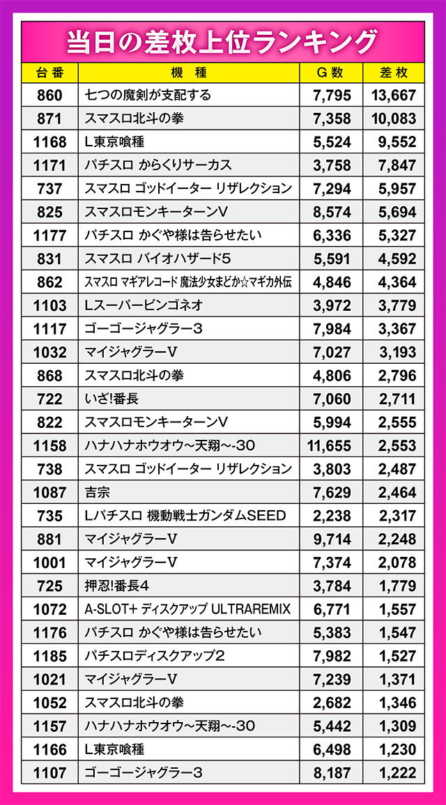 まさかバラエティーコーナーに1台だけ設置の『七つの魔剣が支配する』から13,000枚オーバー記録が飛び出し、なおかつこの日の1位記録になるなど、誰が予想しただろうか。かなり順調に差枚を増やしていた『スマスロ北斗の拳』871番台ですらその勢いに押され、首位の座を譲る結果に。