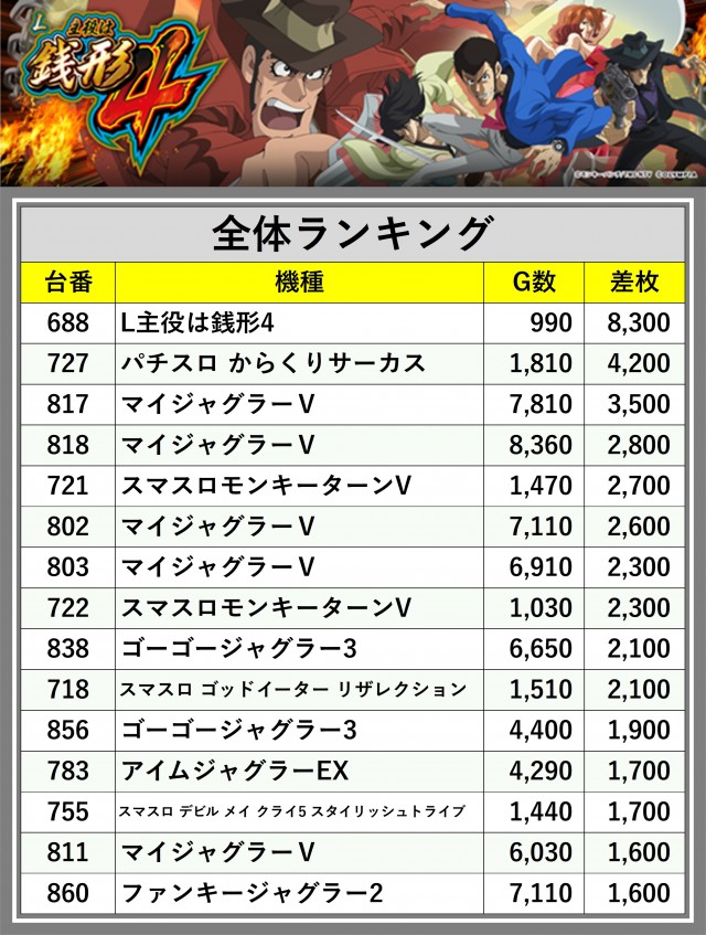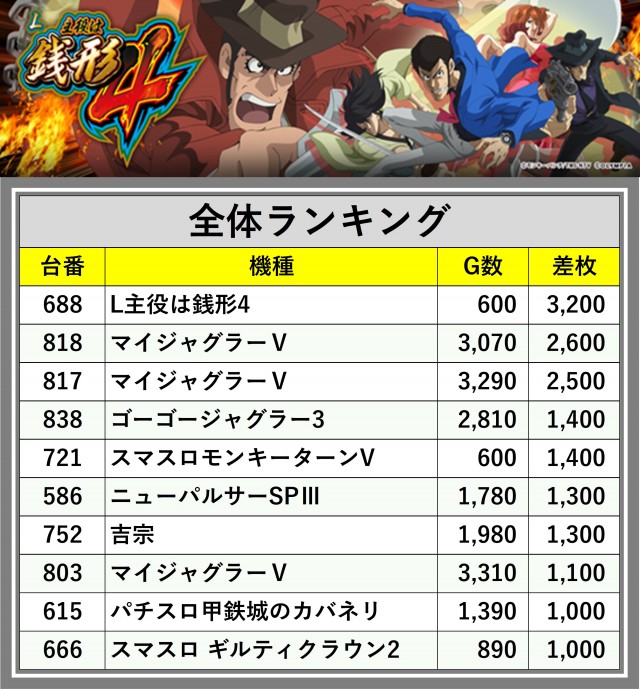 厳選された取材対象機種をはじめ、その他スロット全体から好記録が飛び出した!プレイヤーが楽しんだ1日を下記データにて振り返ってみて欲しい。