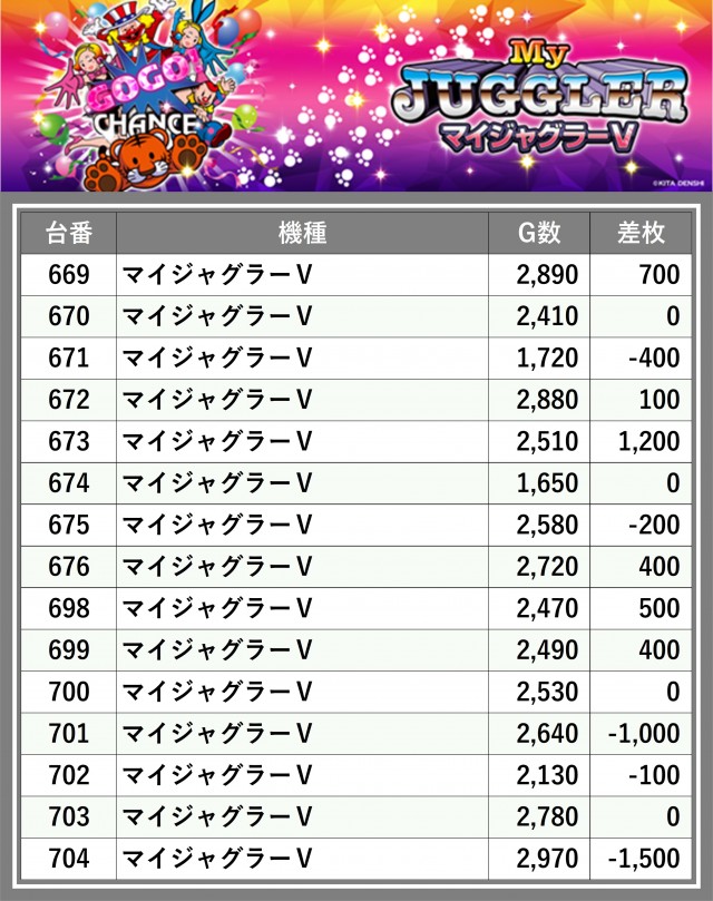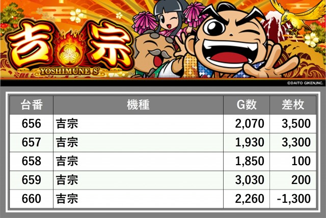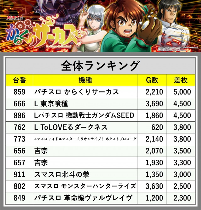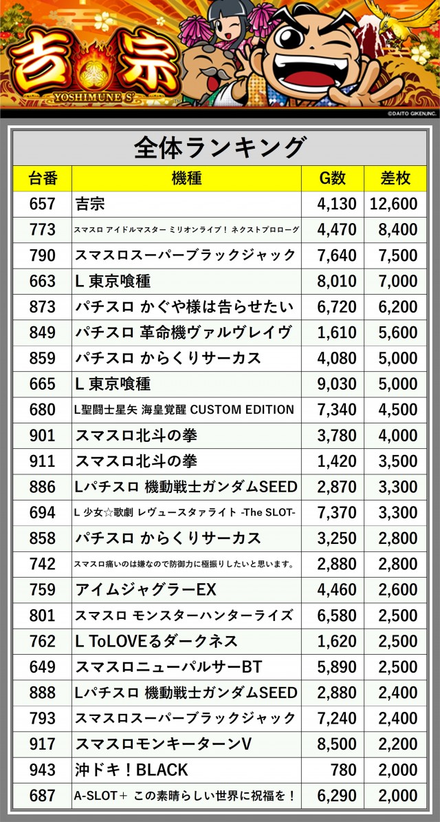 厳選された取材対象機種をはじめ、その他スロット全体から好記録が飛び出した!プレイヤーが楽しんだ1日を下記データにて振り返ってみて欲しい。