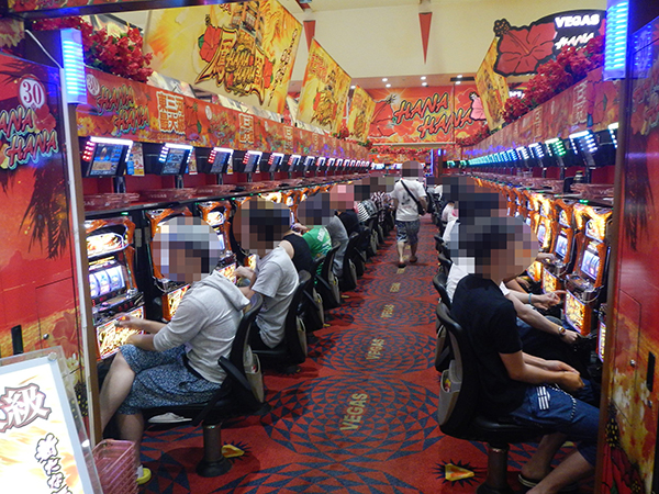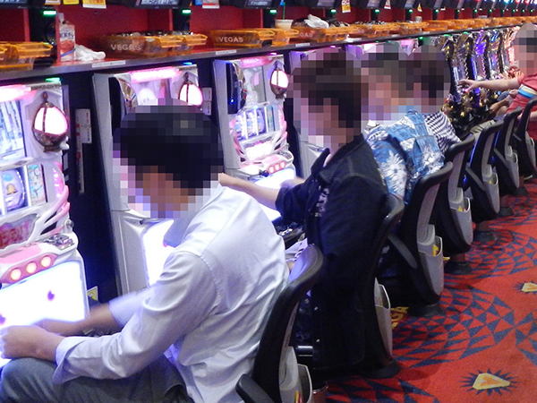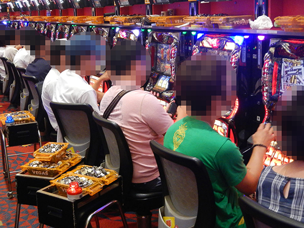 20円パチスロでは、「ハナハナ鳳凰-30」などの沖スロを筆頭に、「バジリスク~甲賀忍法帖~絆」や「押忍!番長3」といった定番機種がほぼ満席状態だった。