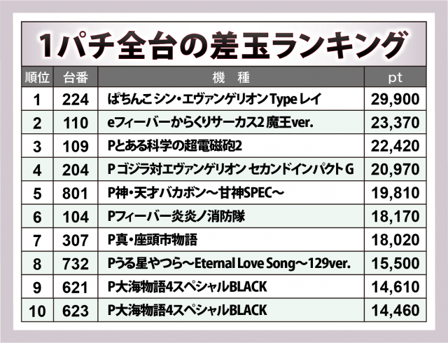 こちらのトップ3は、『ぱちんこ シン・エヴァンゲリオン Type レイ』の+30,000個弱、『eフィーバーからくりサーカス2 魔王ver.』の+23,400個弱、『Pとある科学の超電磁砲2』の+22,400個超など、P機の定番機種からスマパチまで実力を発揮。