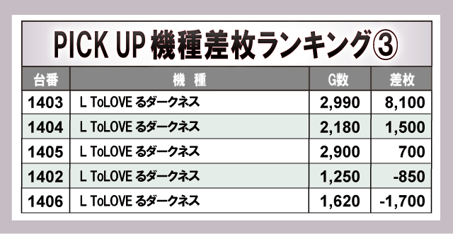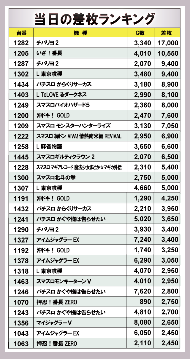 差枚ランキングには人気機種を中心に名を連ねており、『チバリヨ2』『いざ!番長』から万枚OVERが発生!さらに、『チバリヨ2』『L 東京喰種』で+9,000枚OVER、『パチスロ からくりサーカス』『L ToLOVEるダークネス』『スマスロバイオハザード5』で+8,000枚OVERを記録するなど、店内の盛り上がりに大きく貢献していた。ほかにもまとまった出玉を確保する台を多く確認でき、遊技していたファンは打ちごたえのある環境に喜びを覗かせていた。