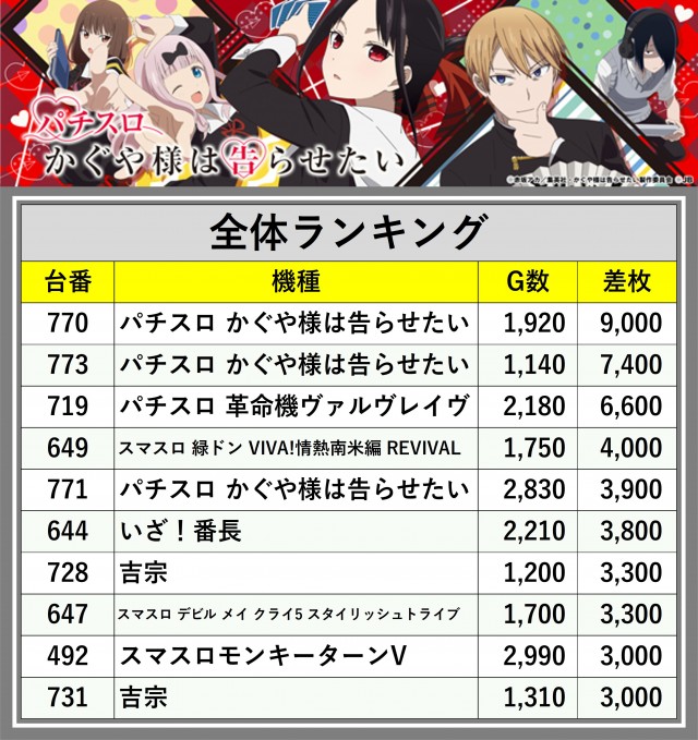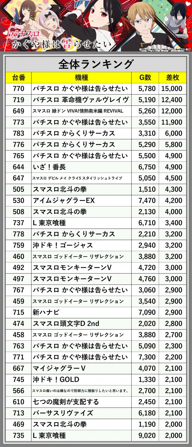 厳選された取材対象機種をはじめ、その他スロット全体から好記録が飛び出した!プレイヤーが楽しんだ1日を下記データにて振り返ってみて欲しい。