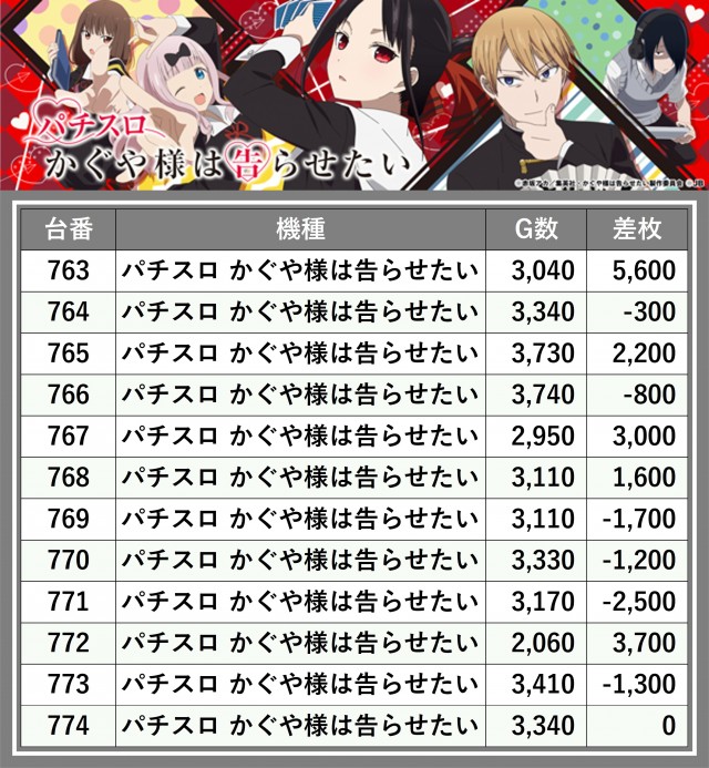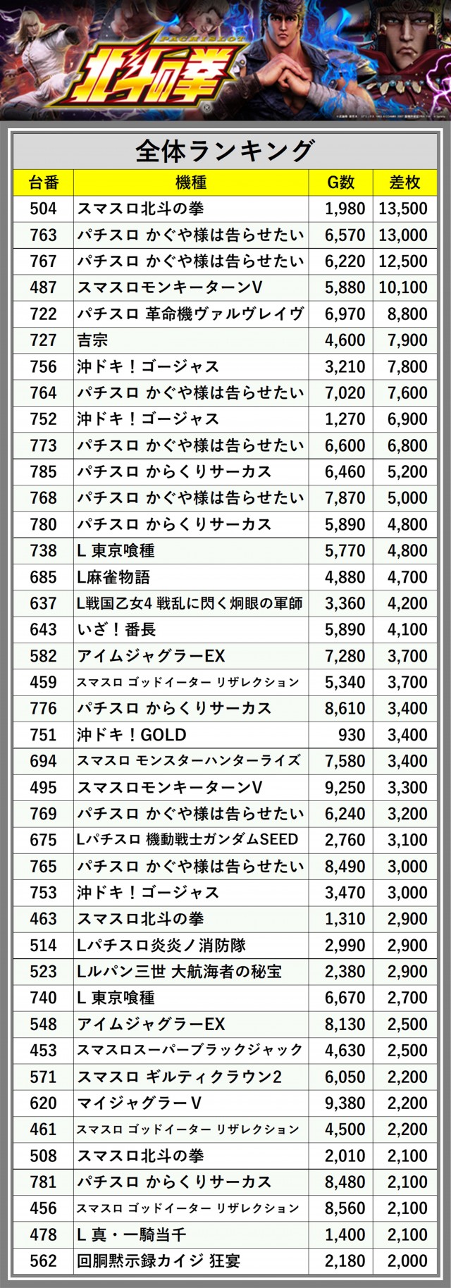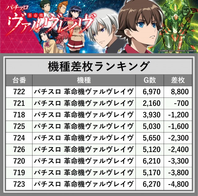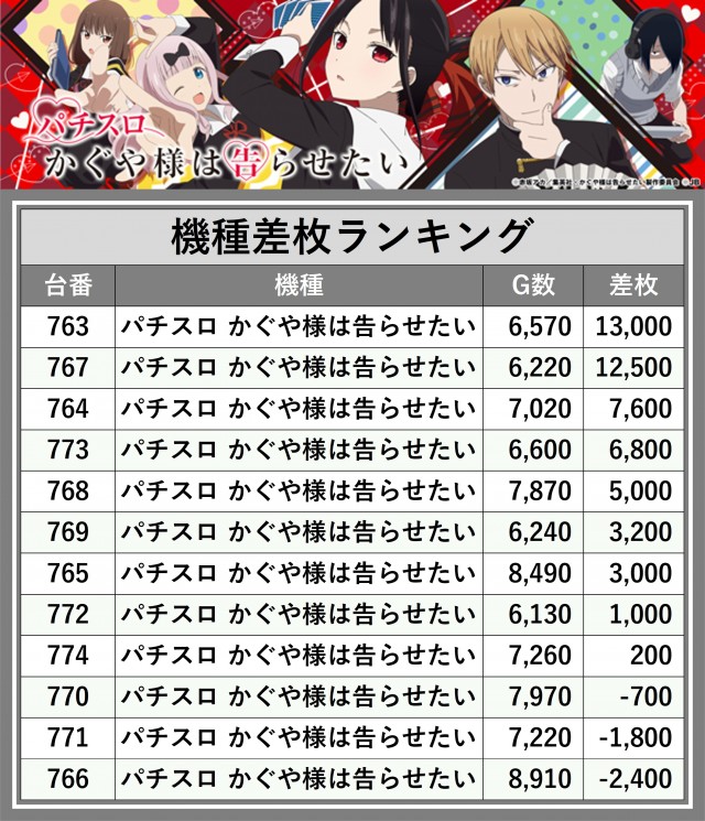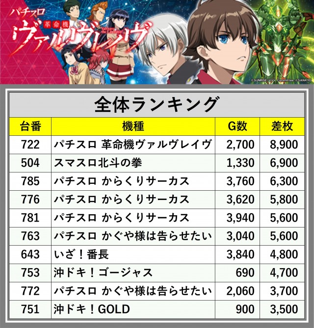 ※差枚数順に掲載しています