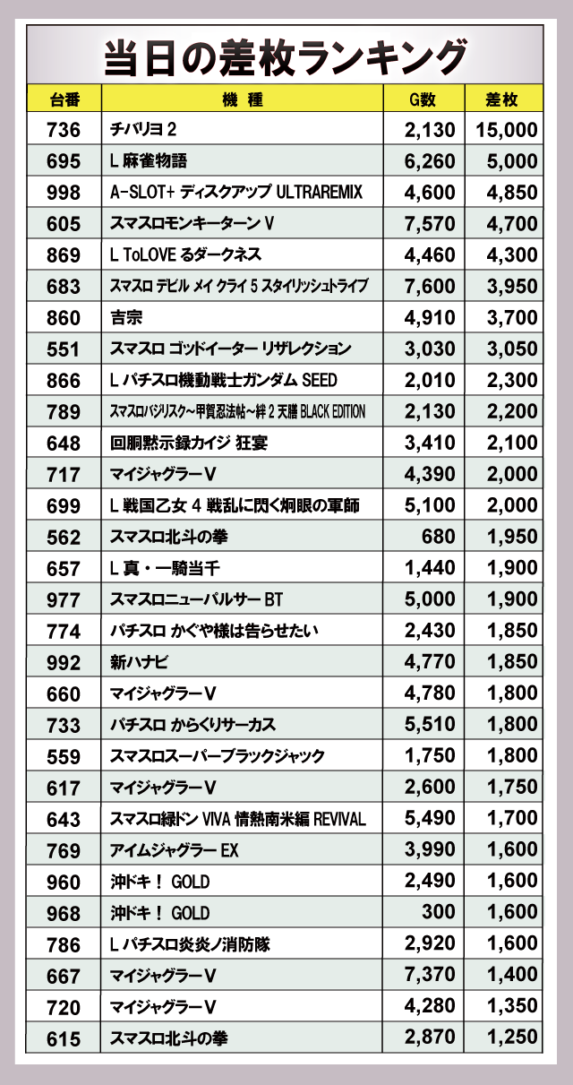 上表の機種は店内を盛り上げる存在となり、遊技したファンは好感触を得ていたのは間違いない。その中で『チバリヨ2』で万枚OVERが発生し、店内の盛り上がりをリードする存在となっていた。次いで『L麻雀物語』から+5,000枚OVERをマーク。ほかにも『沖ドキ!GOLD』や『ジャグラー』シリーズといったメダル機も名を連ね、その存在感をアピールしていたのが鮮烈だ。