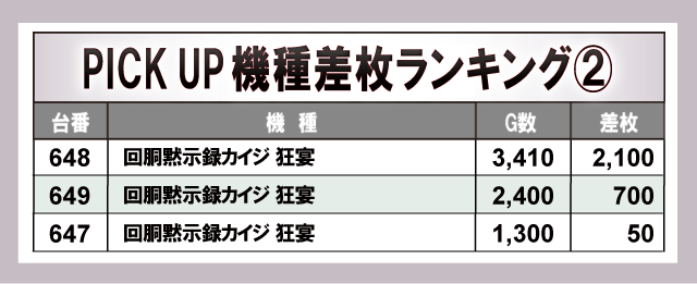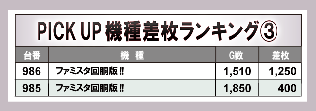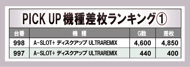 当日、特に盛り上がりを見せていた『A-SLOT+ ディスクアップ ULTRAREMIX』『回胴黙示録カイジ 狂宴』『ファミスタ回胴版!!』。上表の3機種は全台プラス差枚数を達成という好成績をマークしており、コンスタントな当選でファンにとって叩き甲斐のある状況だったに違いない。
