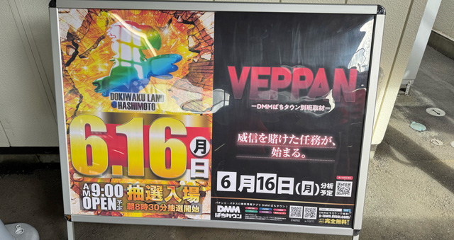 DMMぱちタウン取材班〝別班〟が威信を賭けて執り行う「VEPPAN」が、6月16日に「ドキわくランド橋本店」にて実施された。取材当日は32人のファンが訪れ店内は大賑わいで、遊技する多くのファン達それぞれが存分に楽しんでいる様子を確認することができた。果たしてどのような結果を見せてくれたのか。ここからは全226台の詳細とともに、当日の店内の盛り上がりをチェックしていこう。