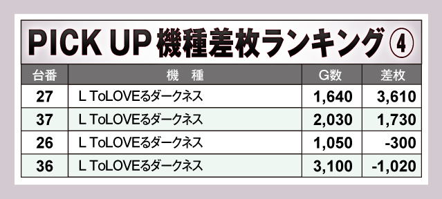 続いてはピックアップ4機種の紹介をしていこう。どの機種にも良台が出現していたが、とくに注目なのは「L ToLOVEるダークネス」の賑わい。ピックアップ4台のうち2台がプラスで、その2台どちらも差枚+1,000枚を超える活躍ぶり。今回取り上げた機種以外にも注目すべき機種や箇所はあったので、やはり存分に楽しめるよう満遍なくチャンスが隠されていたようだ!