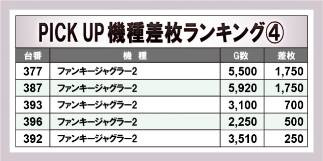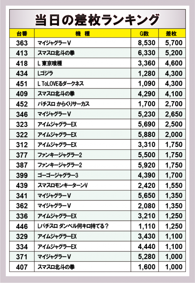 なんとこの日のトップを飾ったのはノーマルタイプの『マイジャグラーⅤ』で+5,700枚をマーク!次点で『スマスロ北斗の拳』『L 東京喰種』とスマスロ人気機種が並び、後続には『ジャグラー』シリーズが大量にランクイン!スペック問わずの環境があったことが分かる内容となった。